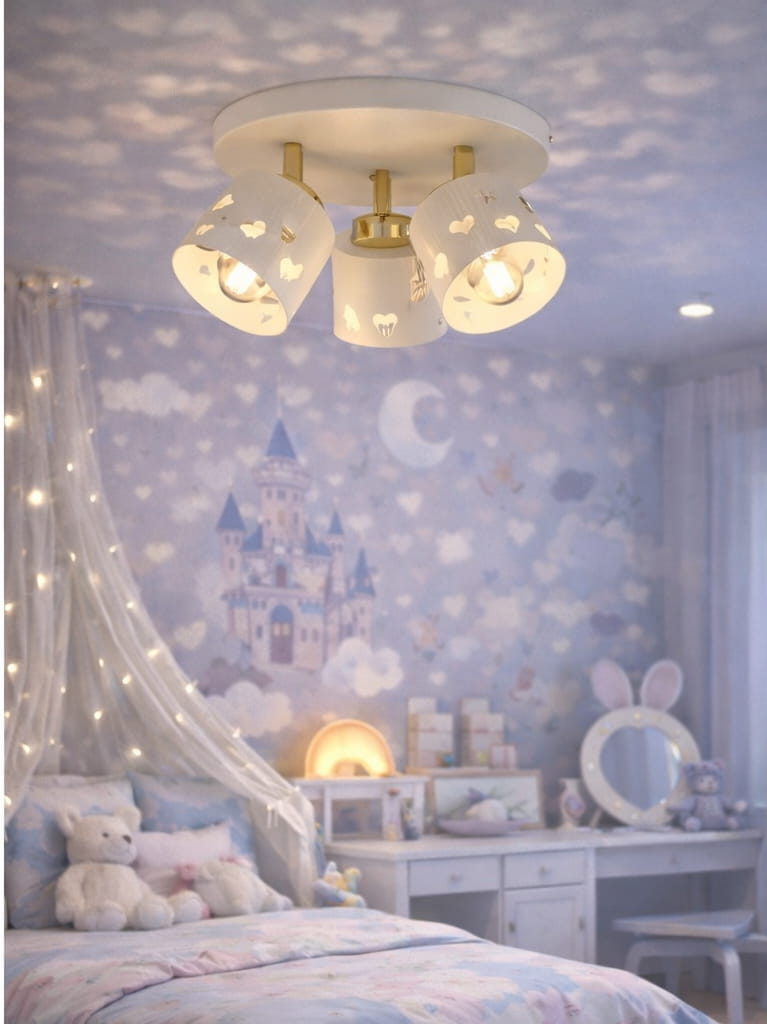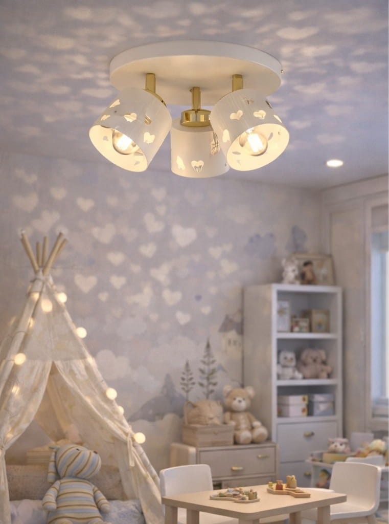 Trzy regulowane źródła światła pozwalają precyzyjnie skierować światło tam, gdzie jest najbardziej potrzebne – nad strefą zabawy, nauki czy odpoczynku. Lampa pełni nie tylko funkcję praktycznego oświetlenia, ale również estetycznej dekoracji, która buduje spokojny i harmonijny klimat w pokoju dziecka.