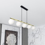 Charakterystycznym elementem kolekcji są subtelne, kuliste klosze wykonane z mlecznego szkła, osadzone na eleganckiej, złotej belce, co nadaje lampom niepowtarzalny szyk i lekkość. Oprawy dostępne są w wersjach cztero- i pięciożarówkowych, co pozwala na idealne dopasowanie do różnych rozmiarów pomieszczeń – od jadalni, przez salon, po reprezentacyjne hole.