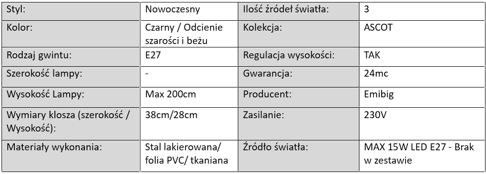 Odkryj wyjątkową kolekcję lamp ASCOT, która łączy przytulność domowego oświetlenia z eleganckim designem. Każda lampa wyposażona jest w stylowy abażur z tkaniny o subtelnej strukturze, dostępny w beżowej i szarej tonacji – idealnej do wnętrz w stylu skandynawskim, nowoczesnym, a nawet klasycznym.