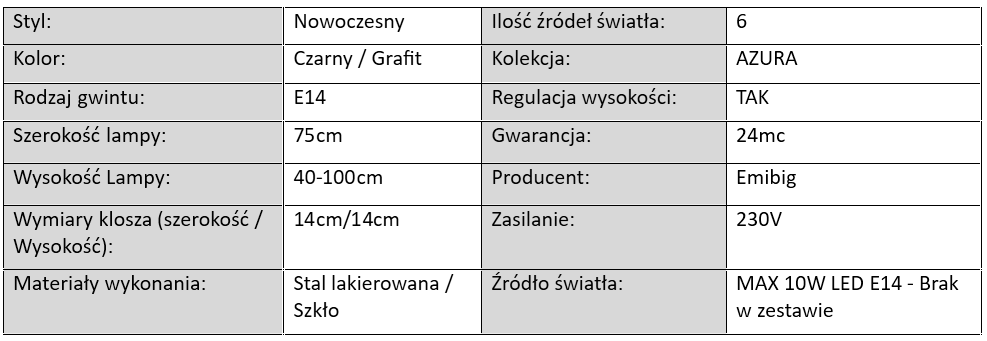 Lampa Wisząca AZURA Klosz Grafit / 6xE14