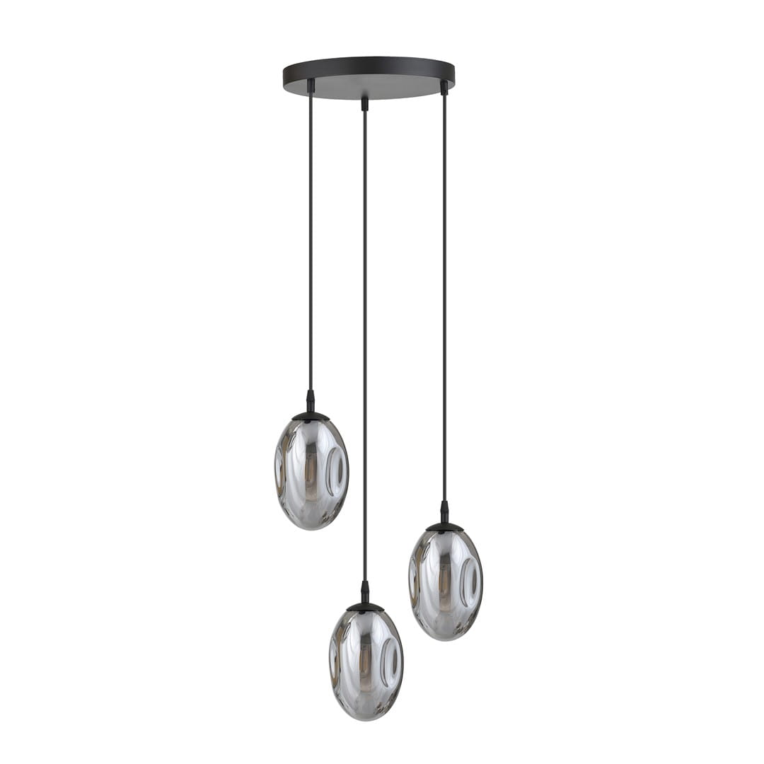 Design: Szklane, owalne klosze z subtelnymi zdobieniami tworzą unikalny efekt wizualny i świetlny. Całość zawieszona na regulowanych przewodach, które umożliwiają dostosowanie wysokości lampy do wnętrza.