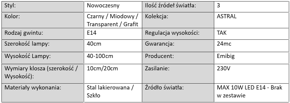 Design: Szklane, owalne klosze z subtelnymi zdobieniami tworzą unikalny efekt wizualny i świetlny. Całość zawieszona na regulowanych przewodach, które umożliwiają dostosowanie wysokości lampy do wnętrza.