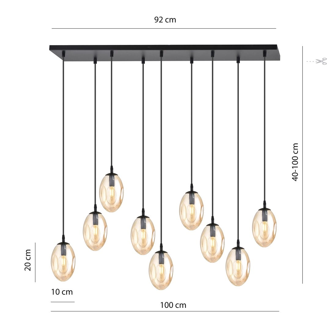 Design: Szklane, owalne klosze z subtelnymi zdobieniami tworzą unikalny efekt wizualny i świetlny. Całość zawieszona na regulowanych przewodach, które umożliwiają dostosowanie wysokości lampy do wnętrza.