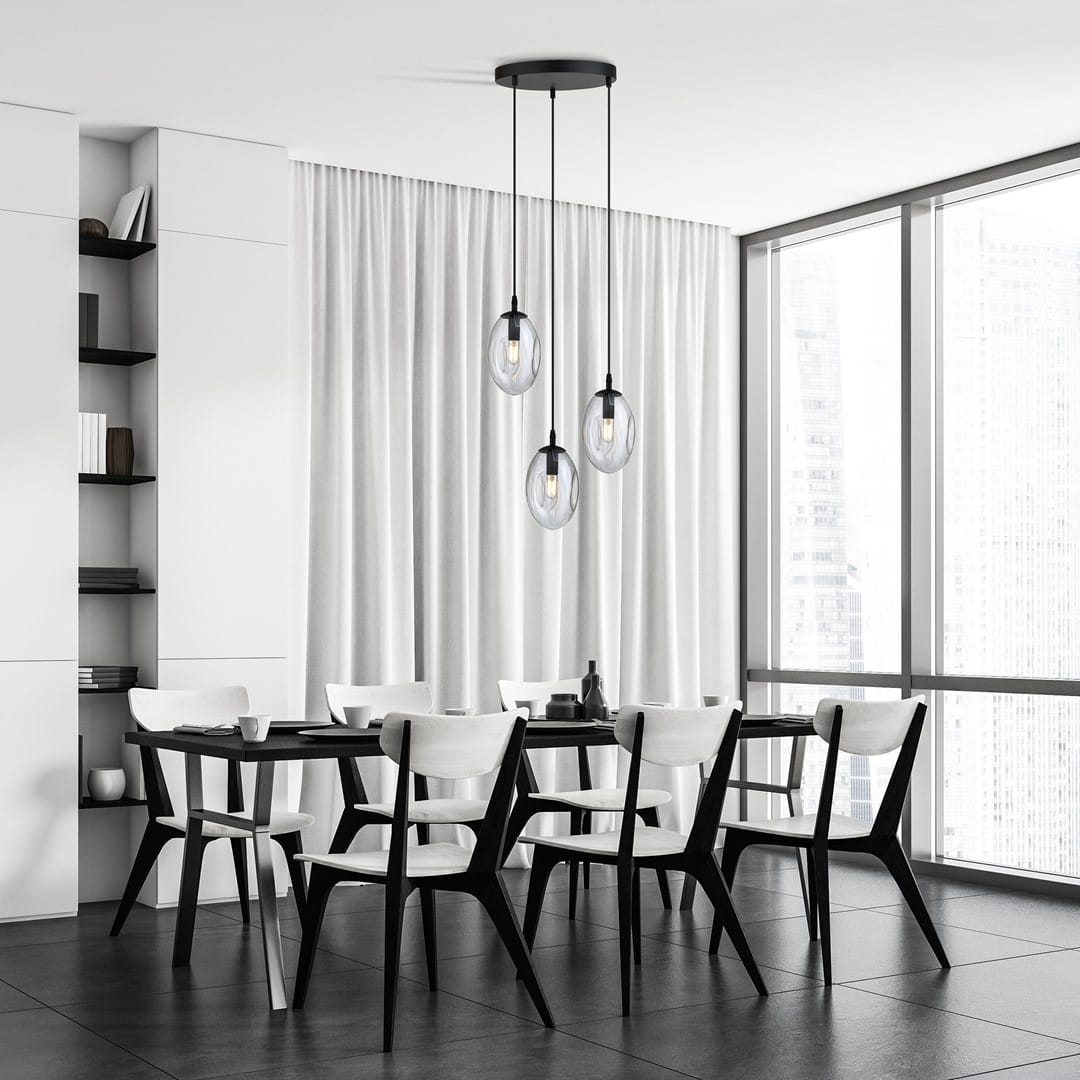 Design: Szklane, owalne klosze z subtelnymi zdobieniami tworzą unikalny efekt wizualny i świetlny. Całość zawieszona na regulowanych przewodach, które umożliwiają dostosowanie wysokości lampy do wnętrza.