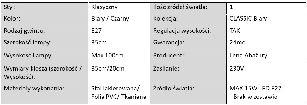 Lampa Wisząca Classic Biała / Cz 35cm / 1xE27