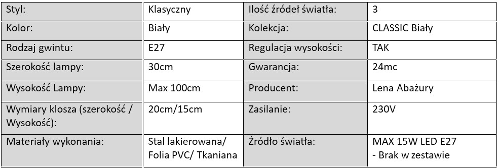 Każda lampa wyposażona jest w standardowy gwint E27, co zapewnia kompatybilność z popularnymi żarówkami LED. Modele występują w wariantach jedno-, dwu- oraz trzypunktowych, co umożliwia dostosowanie natężenia światła do funkcji i metrażu pomieszczenia. Lampy mają biały abażur z elegancką folią wewnętrzną, która równomiernie rozprasza światło i tworzy przytulną atmosferę.