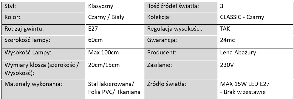 Lampy z serii CLASSIC – Czarny to nie tylko styl, ale także trwałość i funkcjonalność. Każdy model został zaprojektowany z dbałością o detal, co widać zarówno w wykończeniu abażurów, jak i w konstrukcji metalowych stelaży. Stelaże dostępne są w kolorze czarnym lub białym, wykonane z metalu malowanego proszkowo, dzięki czemu są odporne na zarysowania, uszkodzenia i działanie wilgoci.