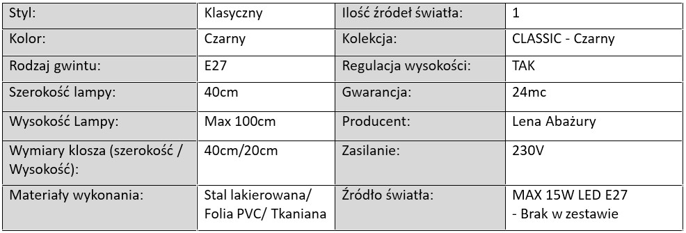 Lampy z serii CLASSIC – Czarny to nie tylko styl, ale także trwałość i funkcjonalność. Każdy model został zaprojektowany z dbałością o detal, co widać zarówno w wykończeniu abażurów, jak i w konstrukcji metalowych stelaży. Stelaże dostępne są w kolorze czarnym lub białym, wykonane z metalu malowanego proszkowo, dzięki czemu są odporne na zarysowania, uszkodzenia i działanie wilgoci.