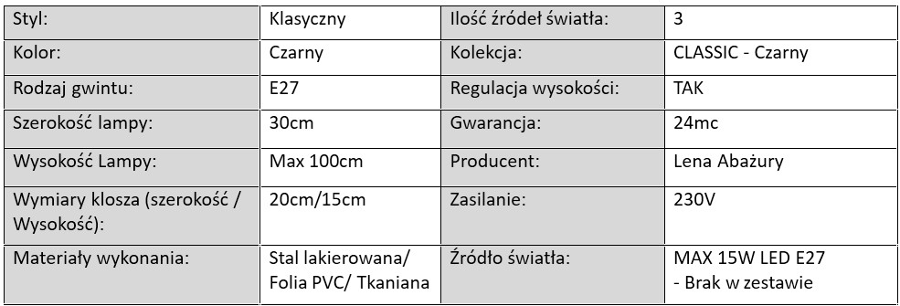 Lampy z serii CLASSIC – Czarny to nie tylko styl, ale także trwałość i funkcjonalność. Każdy model został zaprojektowany z dbałością o detal, co widać zarówno w wykończeniu abażurów, jak i w konstrukcji metalowych stelaży. Stelaże dostępne są w kolorze czarnym lub białym, wykonane z metalu malowanego proszkowo, dzięki czemu są odporne na zarysowania, uszkodzenia i działanie wilgoci.