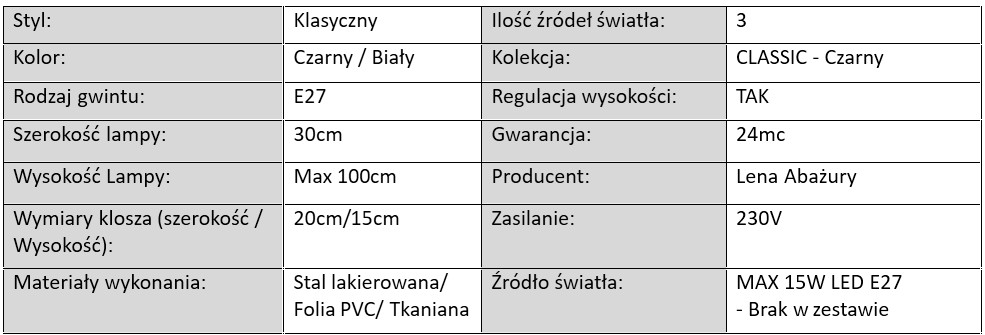 Lampy z serii CLASSIC – Czarny to nie tylko styl, ale także trwałość i funkcjonalność. Każdy model został zaprojektowany z dbałością o detal, co widać zarówno w wykończeniu abażurów, jak i w konstrukcji metalowych stelaży. Stelaże dostępne są w kolorze czarnym lub białym, wykonane z metalu malowanego proszkowo, dzięki czemu są odporne na zarysowania, uszkodzenia i działanie wilgoci.