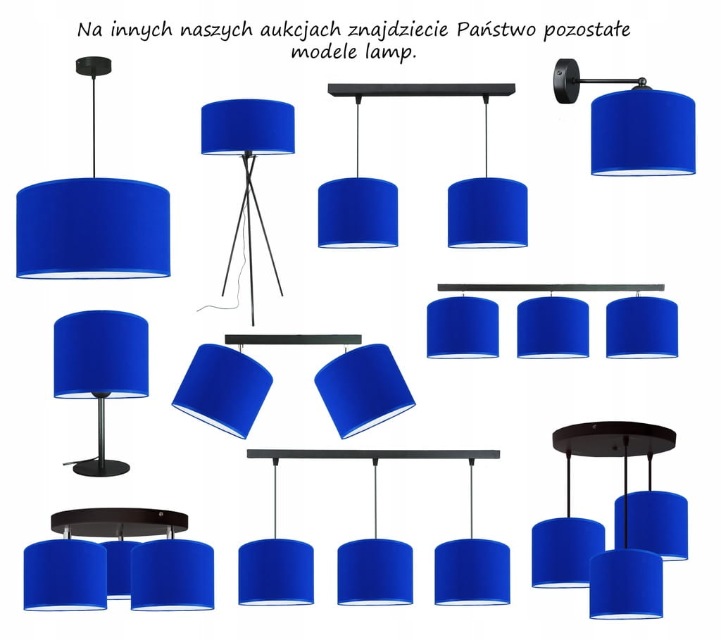 Każda lampa z tej kolekcji wyposażona jest w metalowy stelaż malowany proszkowo, dostępny w wersji czarnej lub białej – dzięki temu z łatwością dopasujesz ją do stylu wnętrza. Abażury wykonane są z wysokiej jakości tkaniny w intensywnym odcieniu granatowym, który pod światłem ukazuje lekki, chabrowy połysk. Wnętrze abażurów pokryte jest białą folią, która doskonale odbija światło i nadaje wnętrzu przyjemną jasność.