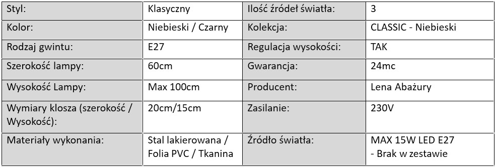 Lampa Wisząca Classic Niebieska /Cz / 3xE27