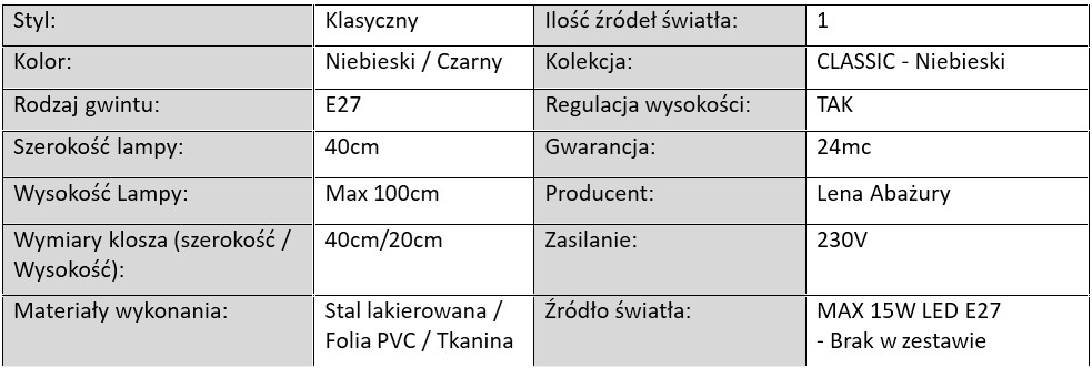 Lampa Wisząca Classic Niebieska /Cz 40cm / 1xE27