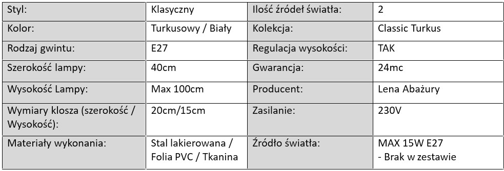 Rodzaje lamp z kolekcji Classic Turkus