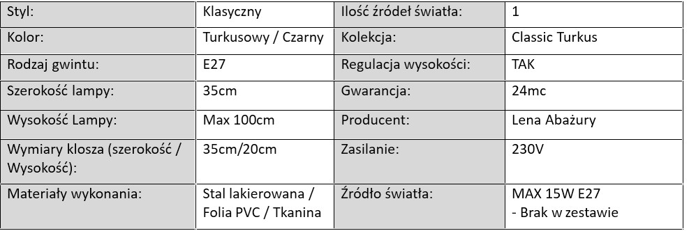 Lampa Wisząca Classic Turkusowa /Cz 35cm / 1xE27