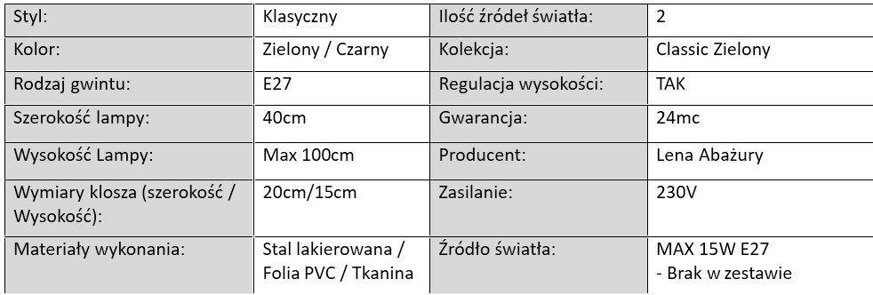 Lampy z serii Classic Butelkowa Zieleń wykonano z wysokiej jakości materiałów. Abażury pokryte są tkaniną w modnym odcieniu butelkowej zieleni, pod którą znajduje się biała folia PVC – zapewnia to równomierne, przyjemne dla oka rozproszenie światła. Całość uzupełniają metalowe stelaże w dwóch wersjach kolorystycznych: klasycznej bieli lub głębokiej czerni, co umożliwia idealne dopasowanie lamp do stylu wnętrza.