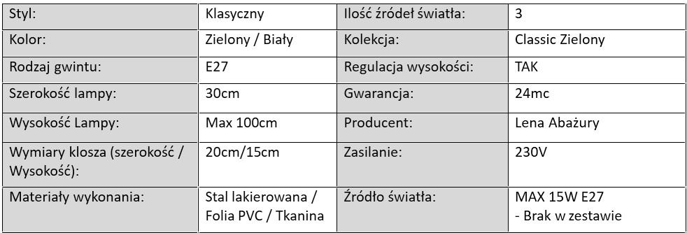 Lampy z serii Classic Butelkowa Zieleń wykonano z wysokiej jakości materiałów. Abażury pokryte są tkaniną w modnym odcieniu butelkowej zieleni, pod którą znajduje się biała folia PVC – zapewnia to równomierne, przyjemne dla oka rozproszenie światła. Całość uzupełniają metalowe stelaże w dwóch wersjach kolorystycznych: klasycznej bieli lub głębokiej czerni, co umożliwia idealne dopasowanie lamp do stylu wnętrza.