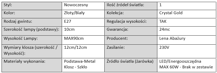 Lampa stołowa czy lampka nocna z kolekcji Crystal Gold to doskonały wybór do sypialni lub eleganckiego biura. Złote akcenty i szklane klosze sprawiają, że lampa nie tylko spełnia swoją funkcję, ale także staje się stylowym elementem dekoracyjnym. Postawiona na stoliku nocnym lub biurku wprowadzi do wnętrza nutę luksusu.
