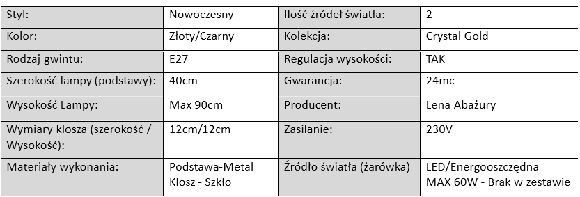 Każda lampa z kolekcji Crystal Gold została wykonana z najwyższej jakości materiałów. Połyskujące złote klosze w połączeniu z transparentnym szkłem tworzą subtelną grę światła, dodając wnętrzu wyjątkowego charakteru.