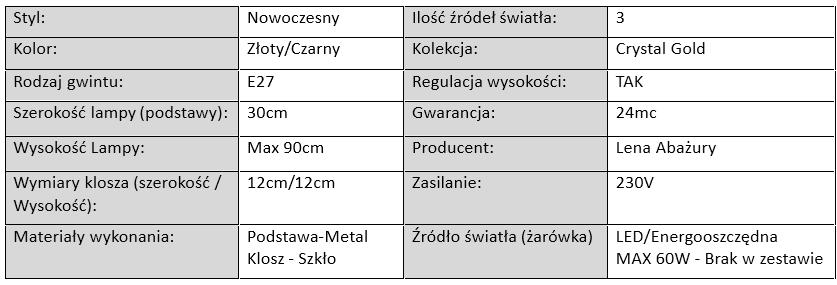 Każda lampa z kolekcji Crystal Gold została wykonana z najwyższej jakości materiałów. Połyskujące złote klosze w połączeniu z transparentnym szkłem tworzą subtelną grę światła, dodając wnętrzu wyjątkowego charakteru.