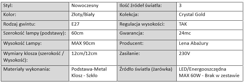 Kolekcja Crystal Gold to wyjątkowe lampy, które łączą w sobie nowoczesny design, elegancję oraz funkcjonalność. To idealne rozwiązanie dla osób poszukujących stylowego oświetlenia do wnętrza, które podkreśli charakter pomieszczenia i nada mu luksusowego wyglądu. W skład kolekcji wchodzą lampy wiszące, lampy sufitowe, kinkiety, lampy stołowe oraz lampki nocne, które doskonale sprawdzą się zarówno w salonie, sypialni, jadalni, jak i w eleganckim biurze czy hotelowym apartamencie.