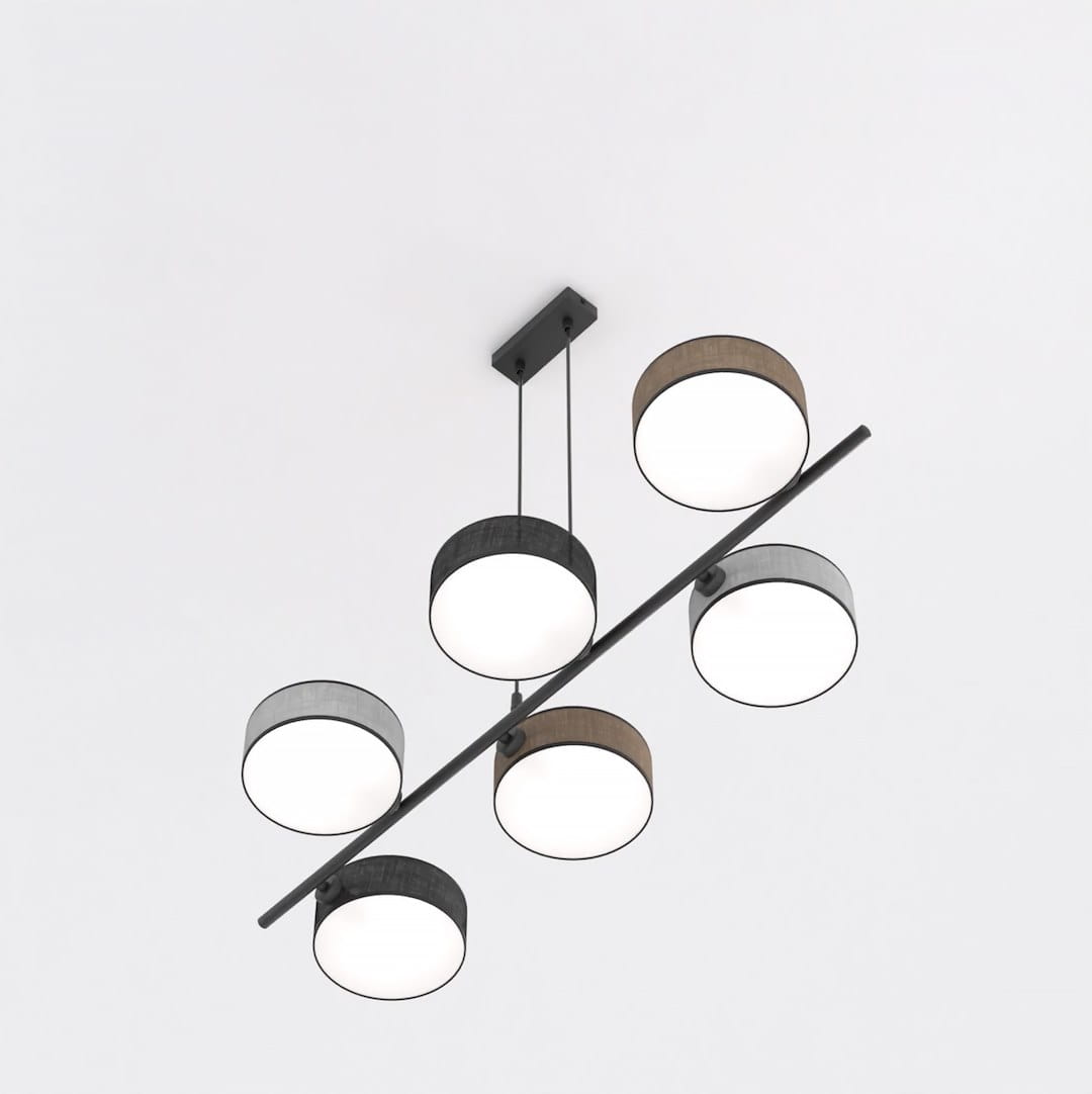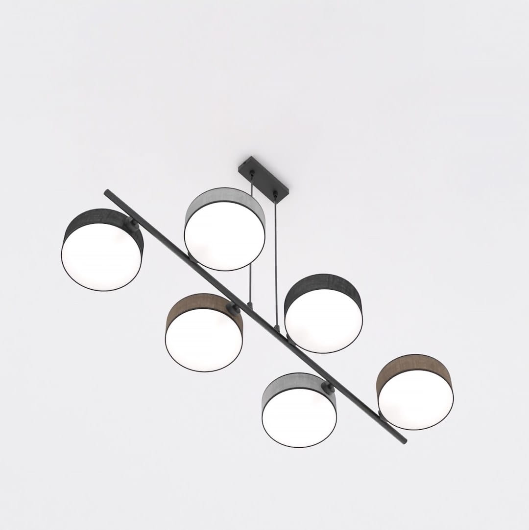Model 6-punktowy to idealne rozwiązanie do większych pomieszczeń – przestronnych salonów, otwartych kuchni połączonych z jadalnią czy loftowych przestrzeni. Lampa przyciąga uwagę swoim geometrycznym układem kloszy i stanowi designerski element dekoracyjny.