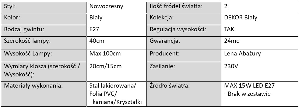 Lampy z kolekcji Dekor Biały to propozycja dla osób ceniących połączenie subtelnej elegancji, ponadczasowego stylu i funkcjonalności. Białe abażury ze stylowym wykończeniem w postaci ozdobnego pasa z kryształków nadają oprawom świetlnym luksusowy charakter, a biała folia wewnątrz klosza dodatkowo wzmacnia rozchodzenie się światła, tworząc we wnętrzu przyjemną i ciepłą atmosferę.