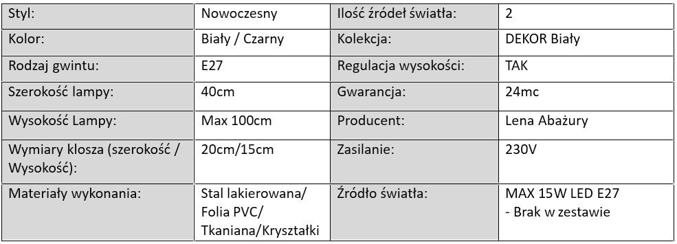 Lampy z kolekcji Dekor Biały to propozycja dla osób ceniących połączenie subtelnej elegancji, ponadczasowego stylu i funkcjonalności. Białe abażury ze stylowym wykończeniem w postaci ozdobnego pasa z kryształków nadają oprawom świetlnym luksusowy charakter, a biała folia wewnątrz klosza dodatkowo wzmacnia rozchodzenie się światła, tworząc we wnętrzu przyjemną i ciepłą atmosferę.