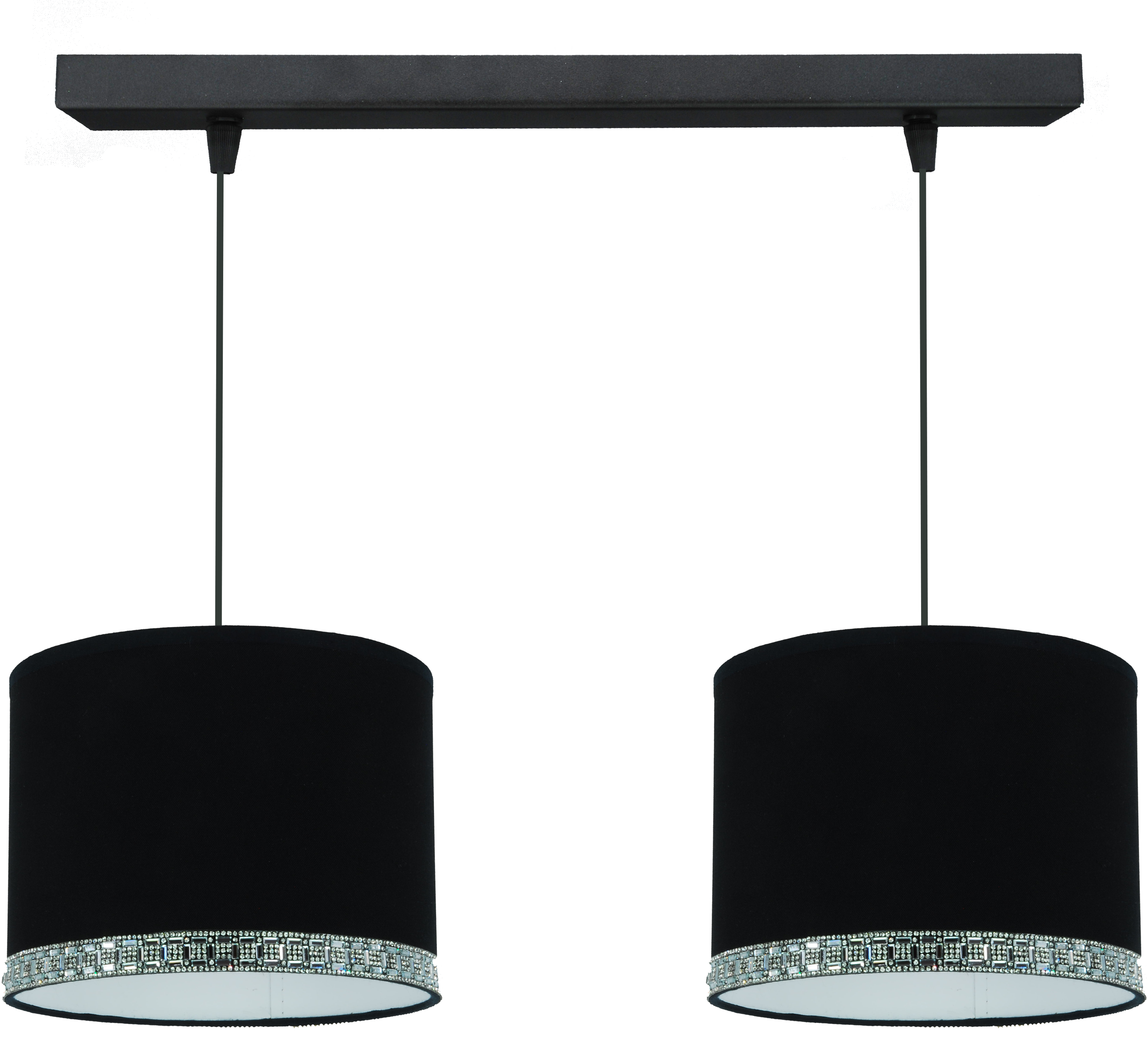 Każda lampa z tej kolekcji została wyposażona w elegancki abażur w kolorze głębokiej czerni, wykończony białą folią wewnętrzną, która skutecznie odbija światło i nadaje wnętrzu przyjemnej jasności. Dolna krawędź abażura ozdobiona jest dekoracyjnym paskiem z połyskujących kryształków, które efektownie błyszczą zarówno w świetle dziennym, jak i sztucznym. To idealne rozwiązanie dla osób szukających oświetlenia z nutą glamour lub nowoczesnej elegancji.