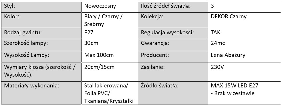 Każda lampa z tej kolekcji została wyposażona w elegancki abażur w kolorze głębokiej czerni, wykończony białą folią wewnętrzną, która skutecznie odbija światło i nadaje wnętrzu przyjemnej jasności. Dolna krawędź abażura ozdobiona jest dekoracyjnym paskiem z połyskujących kryształków, które efektownie błyszczą zarówno w świetle dziennym, jak i sztucznym. To idealne rozwiązanie dla osób szukających oświetlenia z nutą glamour lub nowoczesnej elegancji.