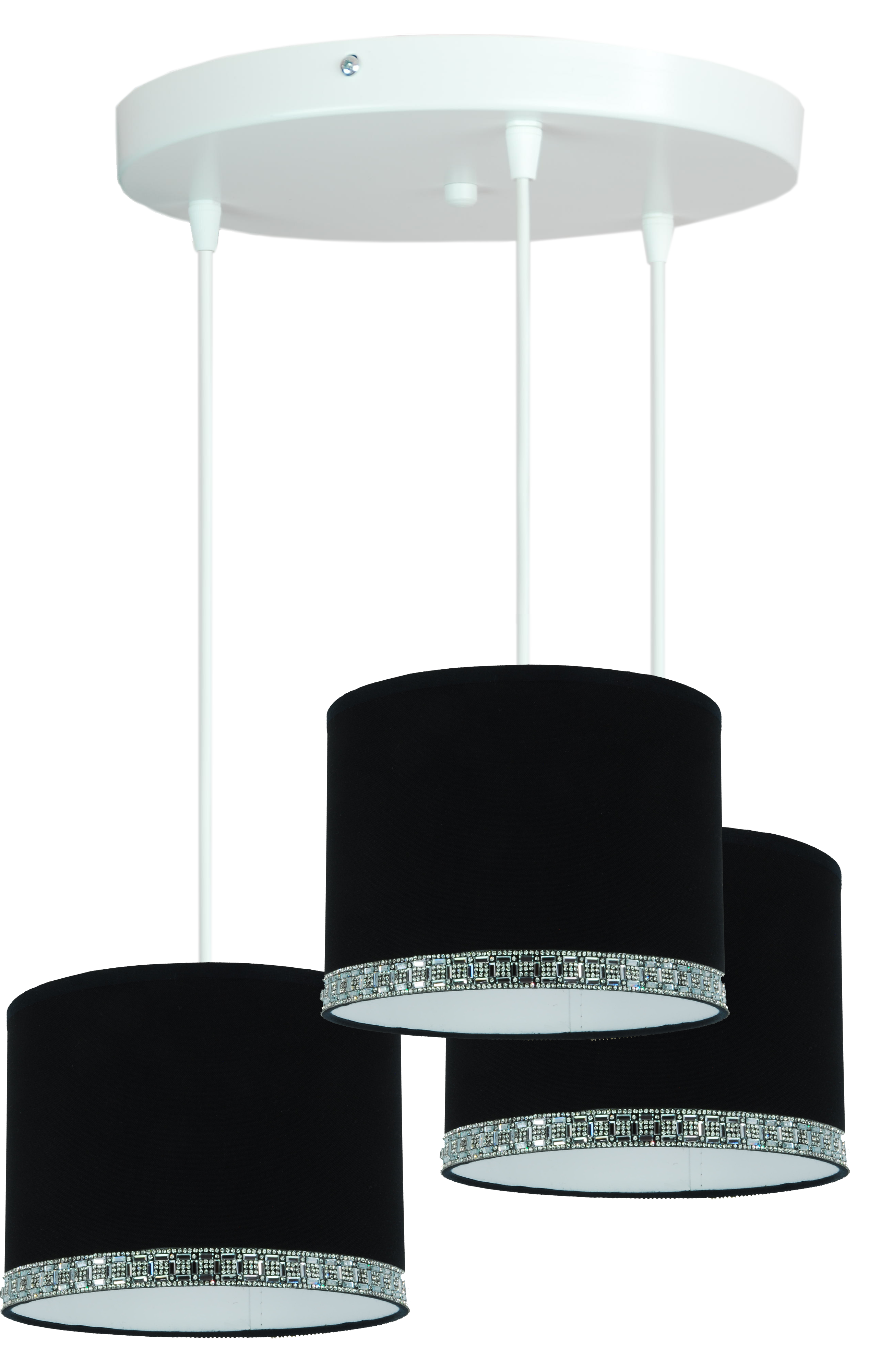 Każda lampa z tej kolekcji została wyposażona w elegancki abażur w kolorze głębokiej czerni, wykończony białą folią wewnętrzną, która skutecznie odbija światło i nadaje wnętrzu przyjemnej jasności. Dolna krawędź abażura ozdobiona jest dekoracyjnym paskiem z połyskujących kryształków, które efektownie błyszczą zarówno w świetle dziennym, jak i sztucznym. To idealne rozwiązanie dla osób szukających oświetlenia z nutą glamour lub nowoczesnej elegancji.