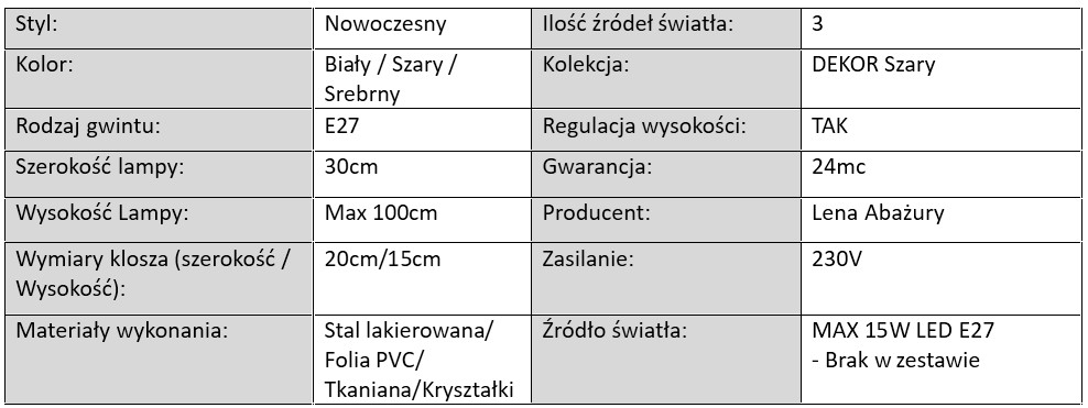 Kolekcja Dekor Szary to wyjątkowe połączenie klasyki i nowoczesności. Lampy wchodzące w jej skład zachwycają subtelną, stonowaną kolorystyką oraz eleganckimi detalami, które sprawiają, że każde wnętrze zyskuje prestiżowy charakter. Szare abażury ozdobione pasem z połyskujących kryształków u dołu prezentują się niezwykle efektownie – idealnie sprawdzą się zarówno w salonie, sypialni, jadalni, jak i w gabinecie czy pokoju gościnnym.