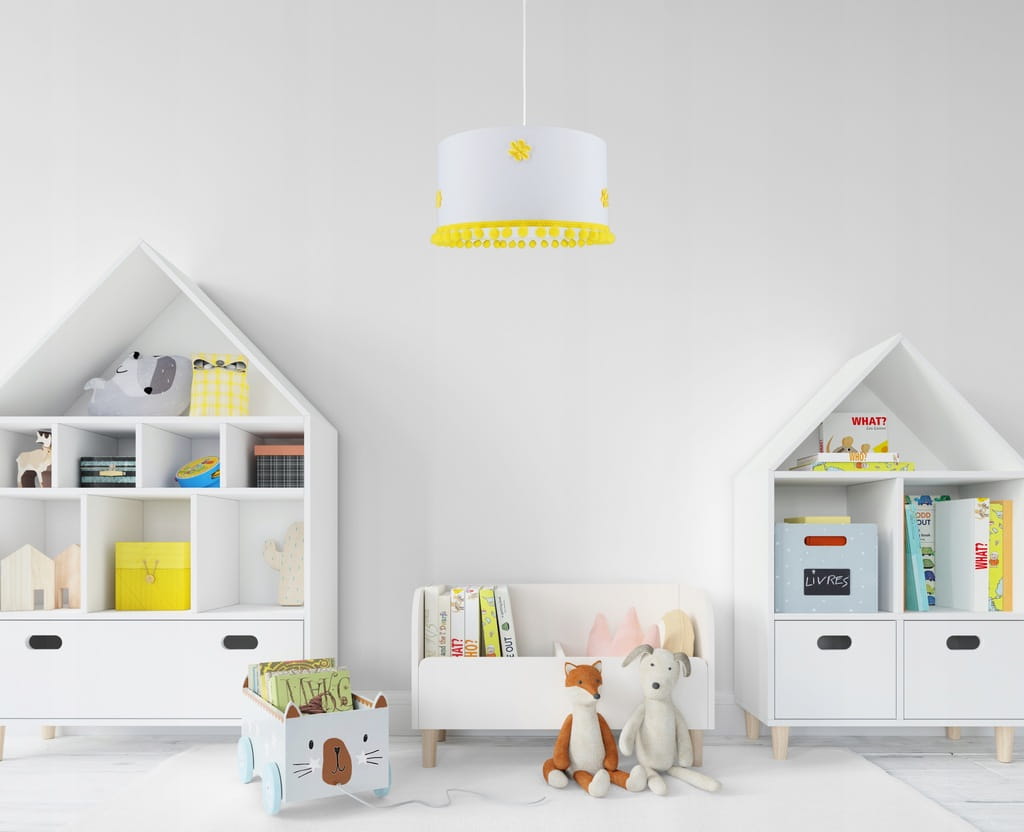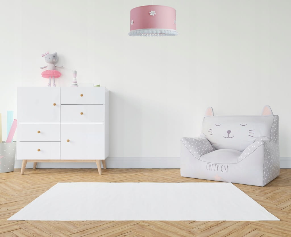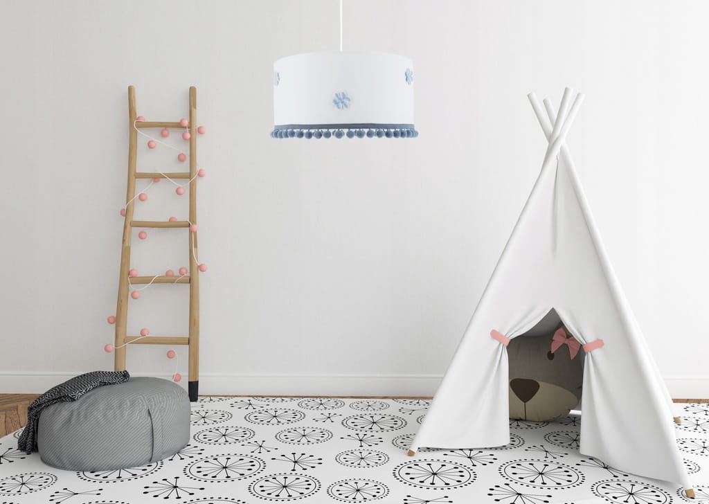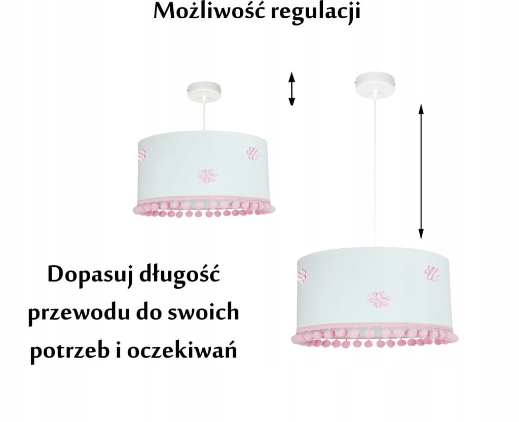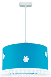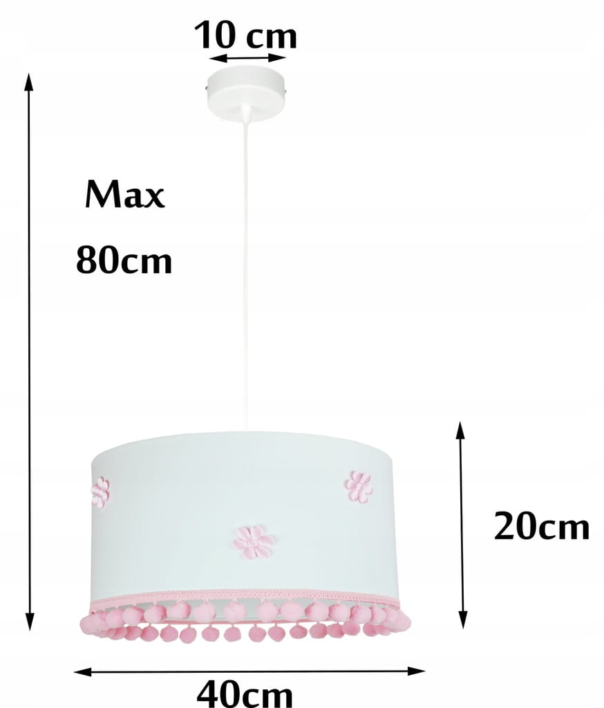 Abażury w kolorze niebieskim wykonane są z wysokiej jakości materiału i wykończone od wewnątrz białą folią odbijającą światło, co zapewnia przyjemną, miękką poświatę – idealną do odpoczynku, zabawy lub wieczornego wyciszenia. Każdy abażur ozdobiony jest trzema uroczymi, białymi kwiatuszkami, które dodają lampie dziecięcego uroku, a całość wieńczy białe pluszowe pąpony – miękkie i subtelne, delikatnie poruszające się przy ruchu powietrza.