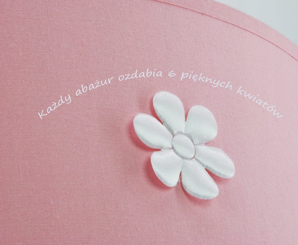 Oświetlenie dziecięce z charakterem – delikatny niebieski kolor, biały środek abażura, kwiatki i pąpony tworzą uroczy design.