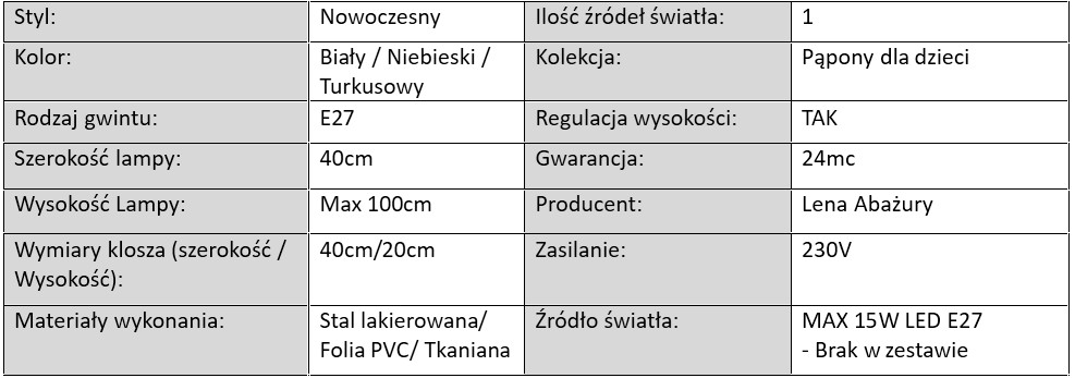 Białe metalowe stelaże są solidne, trwałe i odporne na uszkodzenia – doskonale komponują się z kolorystyką abażurów, tworząc spójną, subtelną całość. Niezależnie od tego, czy urządzisz pokój w stylu skandynawskim, klasycznym czy pastelowym – lampy z kolekcji Pąpony Niebieskie idealnie wpiszą się w przestrzeń dziecięcego świata.