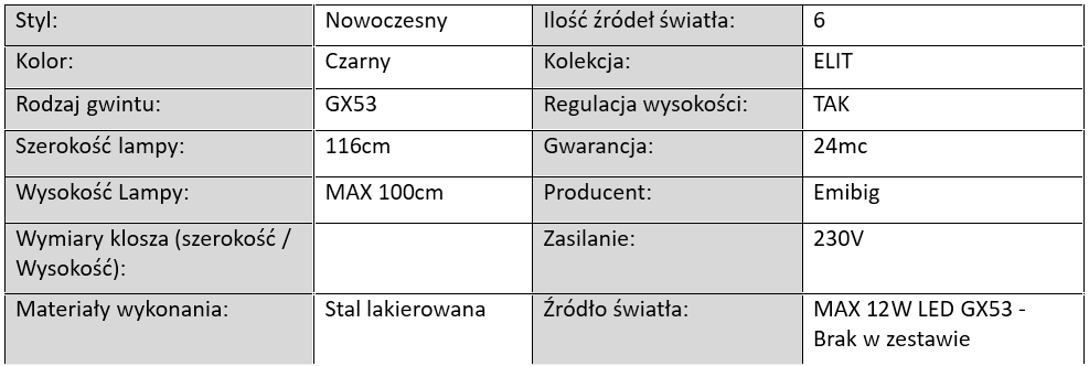Lampa Wisząca ELIT Czarna / 6 x GX53