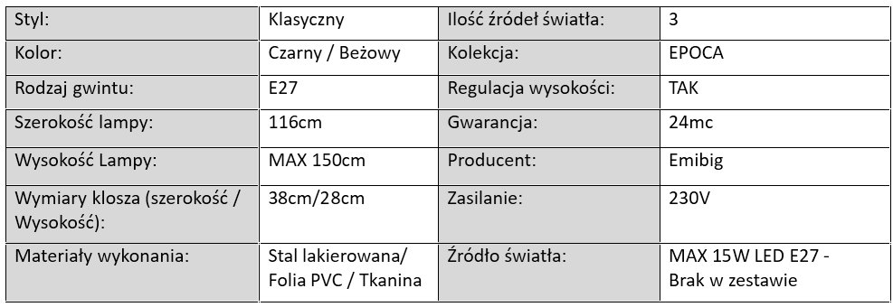 Kolekcja EPOCA to idealne połączenie klasycznego stylu z nowoczesną formą. Lampy wiszące z tej serii wyróżniają się czarnym, metalowym stelażem i tekstylnymi abażurami w kolorze szarym lub beżowym, które wprowadzają do wnętrza przytulny klimat i miękkie, rozproszone światło. To doskonała propozycja do wnętrz urządzonych w stylu skandynawskim, klasycznym, nowoczesnym lub naturalnym.