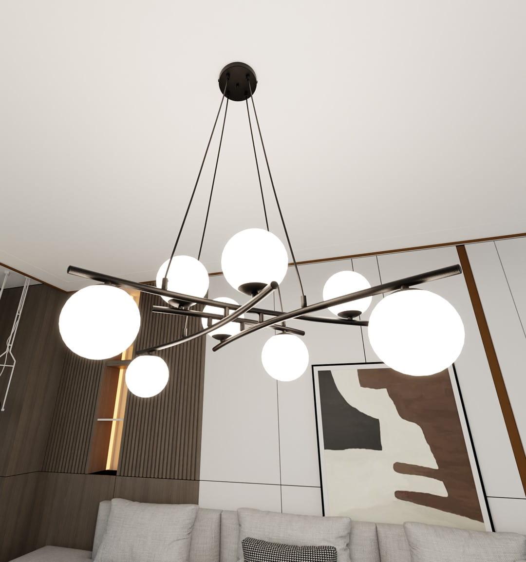 Wielopunktowa forma zapewnia równomierne oświetlenie i efektowny wygląd – niezależnie od tego, czy lampa wisi nad stołem, wyspą kuchenną czy w centralnym punkcie pokoju.