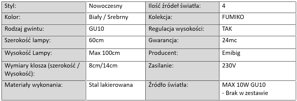 Lampa Wisząca FUMIKO Biało Srebrna / 4xGU10
