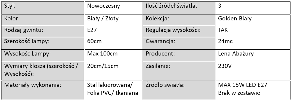 Golden Biały to kolekcja oświetlenia, która zachwyca ponadczasową elegancją i subtelnym urokiem. To lampy stworzone z myślą o wnętrzach, w których liczy się harmonia, światło i estetyczny detal. Połączenie bieli z złotym wnętrzem abażura daje niezwykły efekt wizualny – jasny, ciepły i przyjemny blask, który otula pomieszczenie i podkreśla jego charakter.
