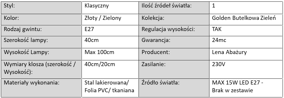 Butelkowa zieleń to jeden z najchętniej wybieranych kolorów w nowoczesnych aranżacjach – kojarzy się z harmonią, naturą i luksusem. W połączeniu ze złotą folią wewnątrz abażura, która pięknie odbija światło i tworzy ciepłą poświatę, tworzy niezwykle efektowny duet, który wprowadza do pomieszczenia głębię i przytulność.
