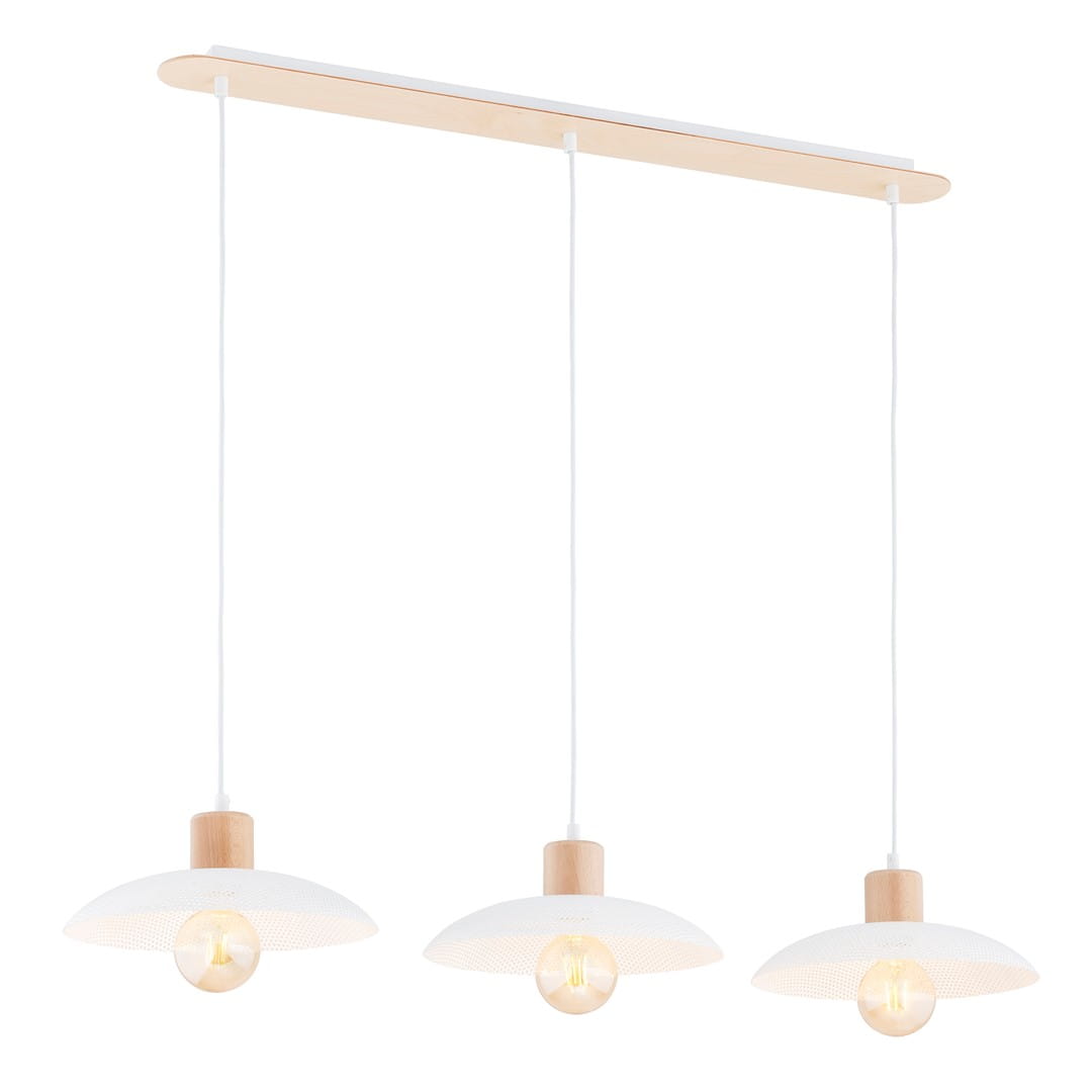 Model 3-punktowy to propozycja do większych przestrzeni – nad stołem w jadalni, wyspą kuchenną czy w salonie. Drewniane detale ocieplają aranżację, a metalowe klosze w czerni lub bieli dodają całości nowoczesnego charakteru.