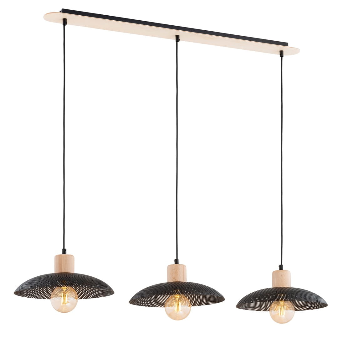 Model 3-punktowy to propozycja do większych przestrzeni – nad stołem w jadalni, wyspą kuchenną czy w salonie. Drewniane detale ocieplają aranżację, a metalowe klosze w czerni lub bieli dodają całości nowoczesnego charakteru.