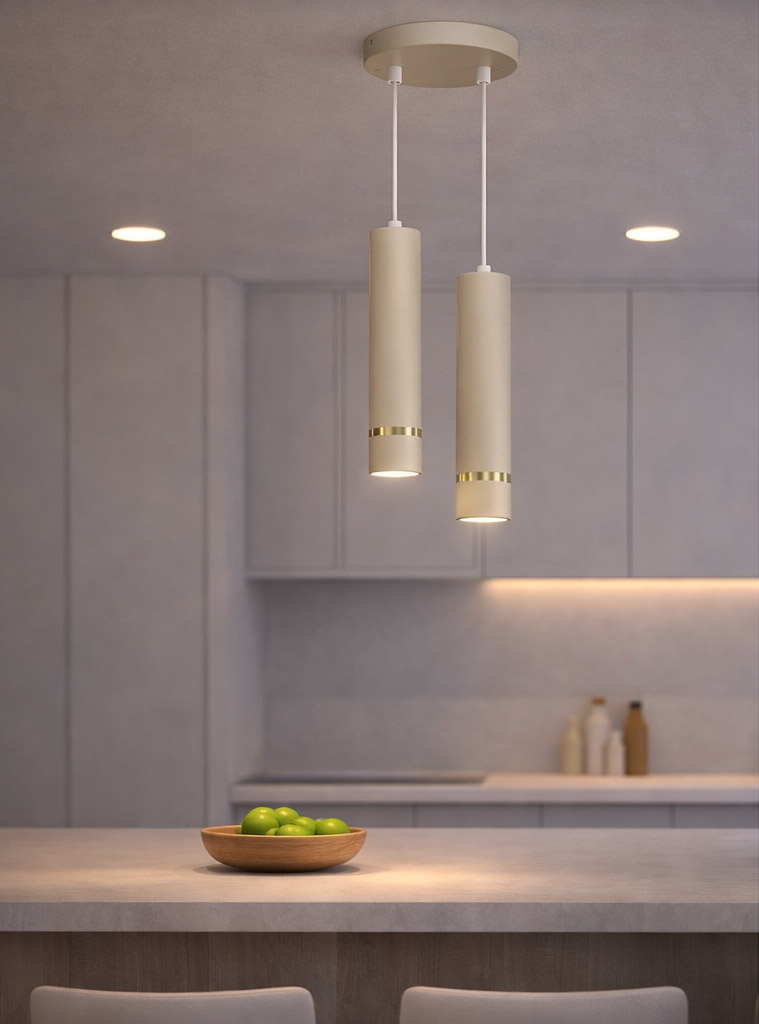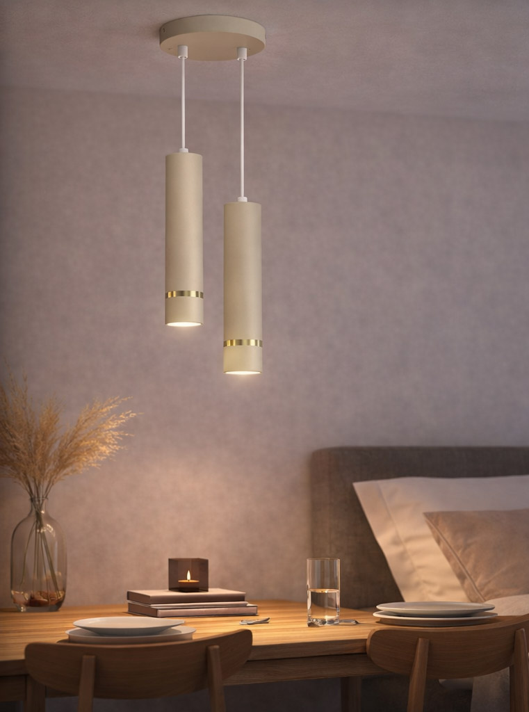 Prosta forma oraz jasna kolorystyka sprawiają, że lampa idealnie wpisuje się w aranżacje nowoczesne, japandi, modern classic, glamour oraz minimalistyczne. Dzięki dwóm źródłom światła doskonale sprawdzi się jako stylowe oświetlenie nad stołem, wyspą kuchenną, barem lub w jadalni.