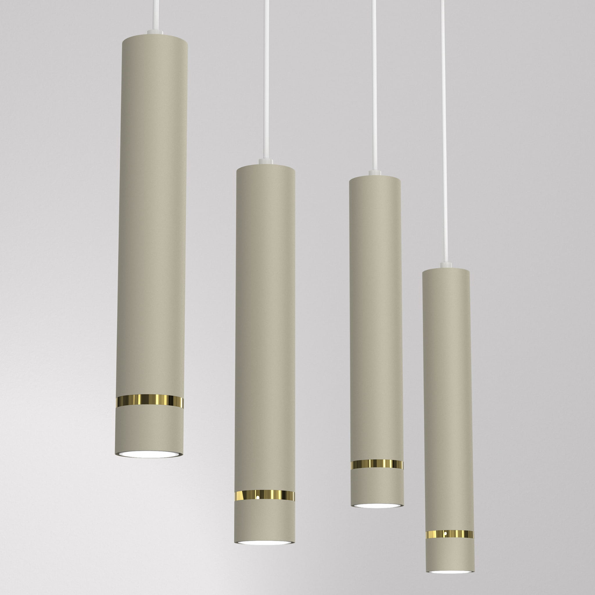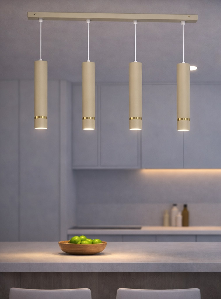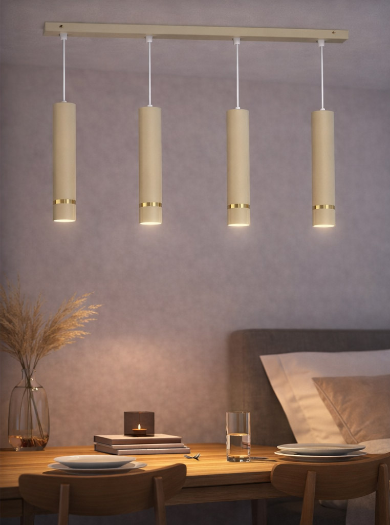 Aurora Gold Beżowa poczwórna to nowoczesna lampa wisząca o minimalistycznej formie, która łączy elegancję z funkcjonalnym oświetleniem. Cztery smukłe, cylindryczne tuby w modnym beżowym kolorze zostały zawieszone na długiej listwie sufitowej i ozdobione subtelnym złotym detalem, który nadaje lampie wyjątkowego charakteru.