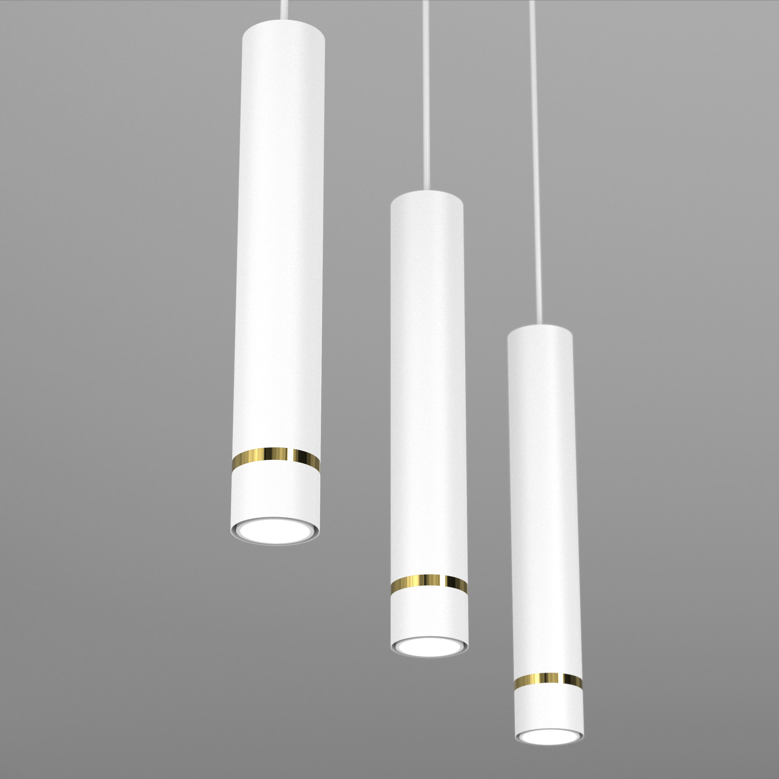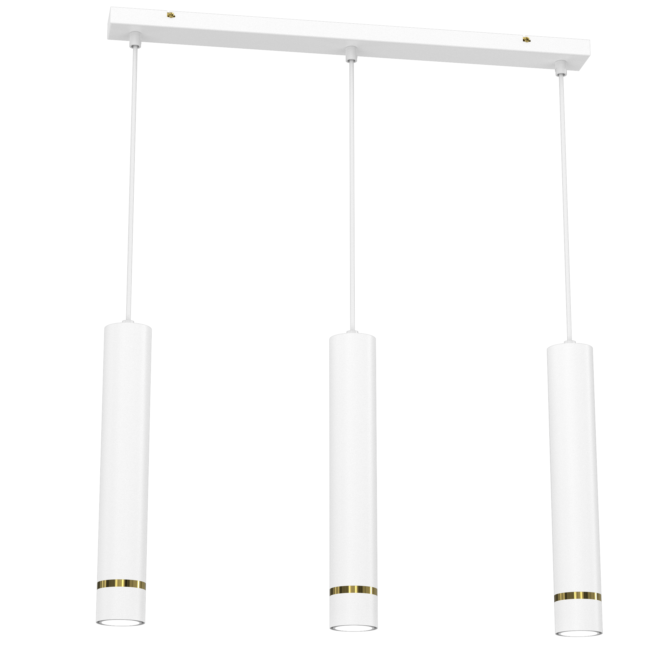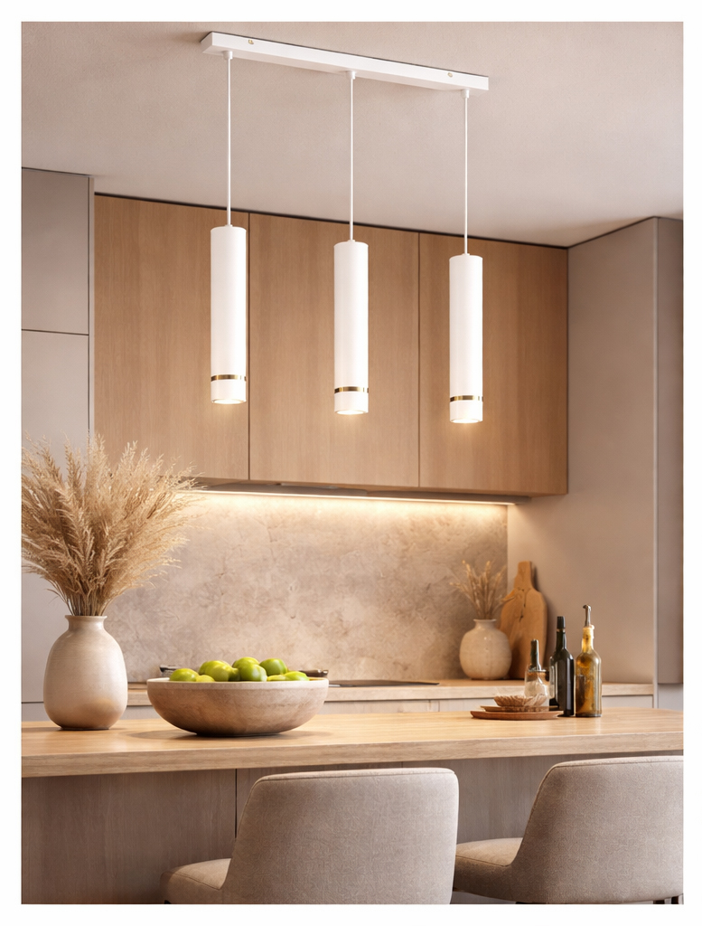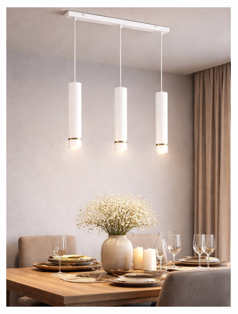 Aurora Gold Biała 3 w wersji na listwie to elegancka, nowoczesna lampa wisząca z trzema smukłymi tubami, która doskonale sprawdzi się jako stylowe oświetlenie nad stołem, wyspą kuchenną lub blatem. Minimalistyczna forma w matowej bieli została uzupełniona subtelnym złotym detalem, dzięki czemu lampa prezentuje się nowocześnie i ponadczasowo.