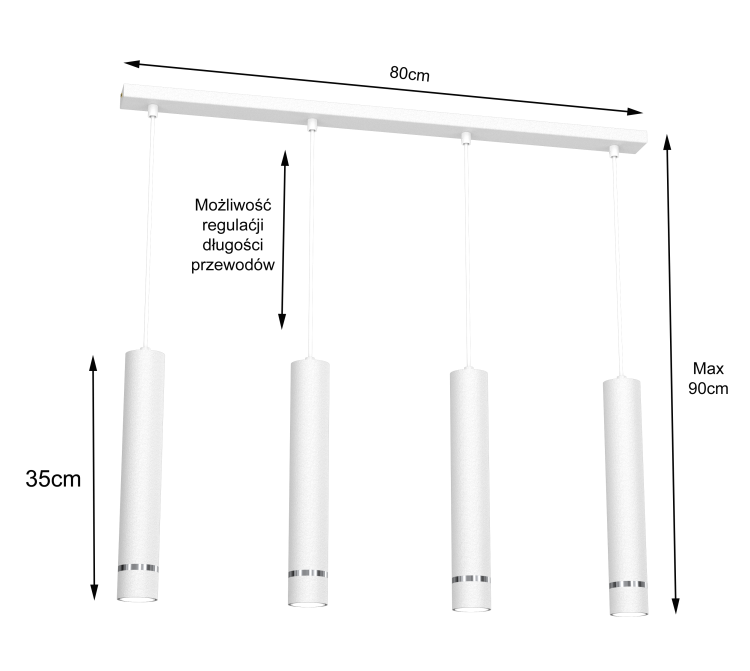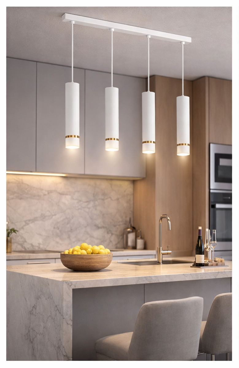 Cztery cylindryczne klosze zawieszone na długiej, geometrycznej listwie zapewniają równomierne i efektowne oświetlenie przestrzeni nad stołem, wyspą kuchenną lub blatem.