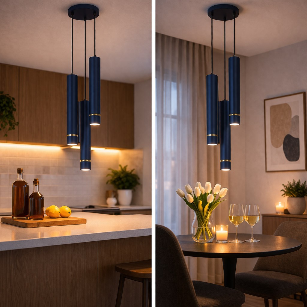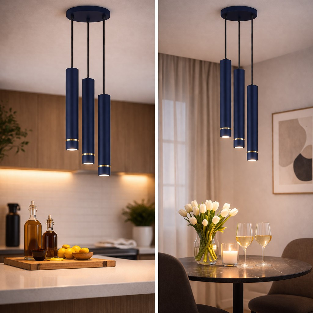 Szukasz oświetlenia, które stanie się centralnym punktem Twojego wnętrza? Aurora Gold Granatowa 3 to nowoczesna lampa wisząca premium z trzema smukłymi kloszami, która łączy minimalistyczną formę z luksusowym wykończeniem.