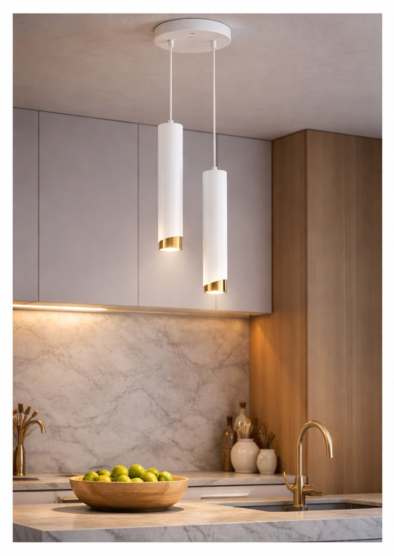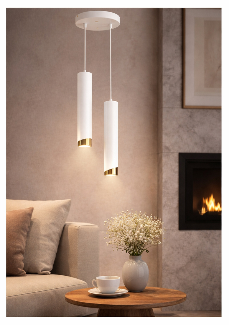 Aurora Luxe Gold Biała 2 to stylowa lampa wisząca z dwoma smukłymi tubami, która łączy minimalistyczny design z eleganckim, luksusowym wykończeniem. Matowa biel w połączeniu ze złotym wykończeniem u dołu kloszy tworzy harmonijną i ponadczasową kompozycję, idealną do wnętrz nowoczesnych, modern classic, glamour oraz japandi.