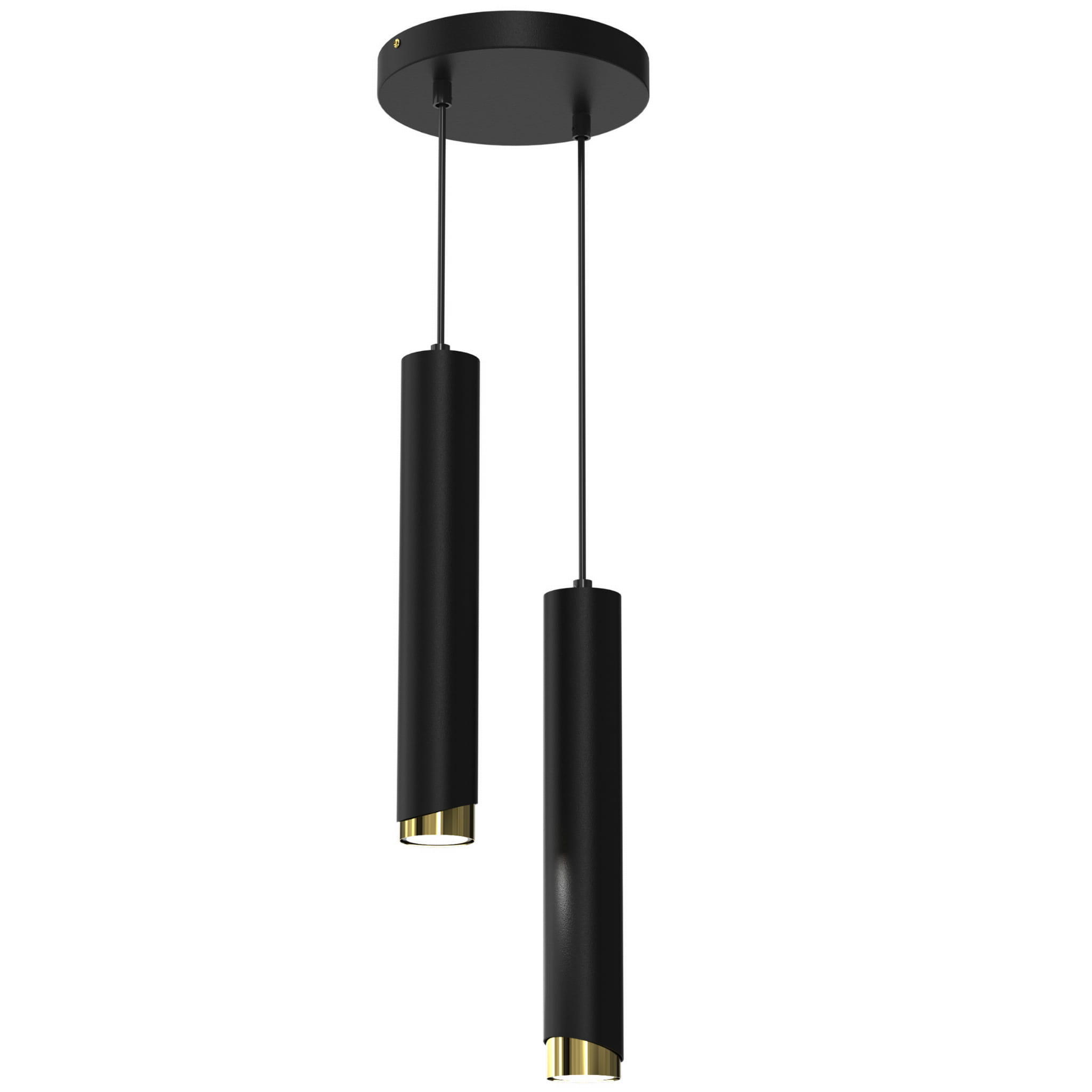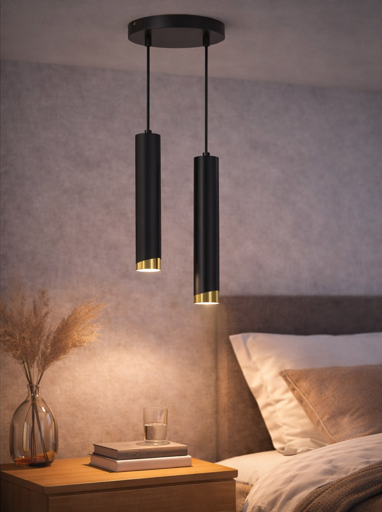 Lampa wisząca Aurora Luxe Gold Czarna podwójna to elegancka i nowoczesna oprawa oświetleniowa, która doskonale łączy minimalistyczny design z luksusowym wykończeniem. Dwie smukłe, cylindryczne tuby w matowej czerni zostały zawieszone na okrągłej podsufitce, a ich wnętrze wykończono efektownym złotym akcentem, który nadaje lampie wyjątkowego charakteru.